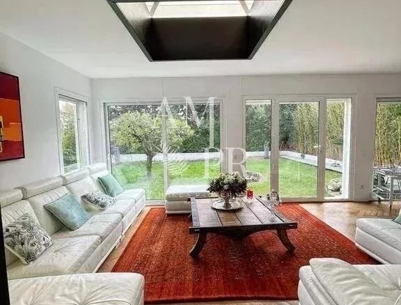 From a magnificent entrance with marble on the floor, a double living / dining room with parquet on the floor, moldings and high ceilings, access to the sunny garden of 600m² with a swimming pool, a fully equipped kitchen with the best brands and finishes. A disabled toilet.