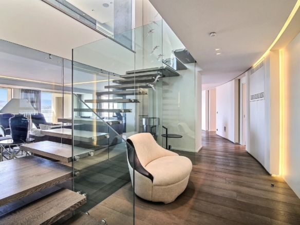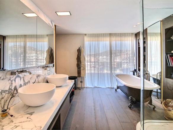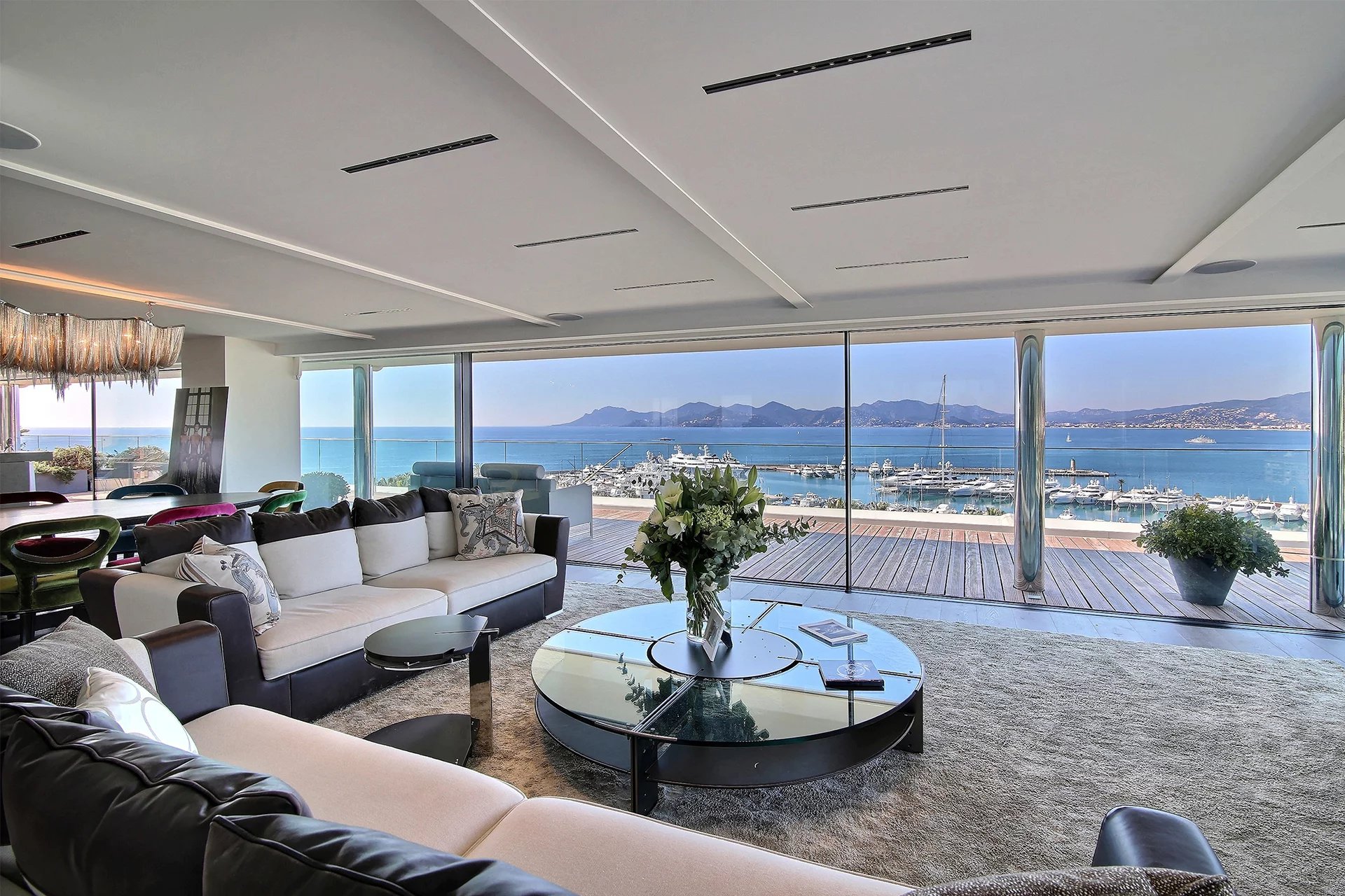 This prestigious penthouse on the Croisette showcases extensive views of the Mediterranean from its 408 m² terrace and 570 m² of living space. It features a living room, dining room, and a fitted kitchen, along with five en-suite bedrooms, including an expansive master suite on the main level.