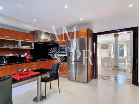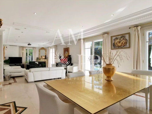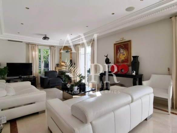 This exceptional property includes a 253 m² mansion, built in 1928 and renovated in 2000, as well as an independent 97 m² caretaker’s house, completely renovated in 2023. The main house offers luxurious amenities with marble floors, underfloor heating, reversible air conditioning, and refined finishes such as decorative gold leaf columns. It has a high-end equipped kitchen with brick wall, garbage disposal, dishwasher, American refrigerator and television, as well as several suites, including one with sofa bed, hammam, dressing room, and laundry room. Upstairs, the bedrooms benefit from high ceilings, functional fireplaces, and marble bathrooms, with a master suite equipped with a jacuzzi and custom furniture. The caretaker’s house has three bedrooms, new reversible air conditioning, electric central heating, and a 57 m² terrace upstairs. The whole is located on a plot of 1,403 m