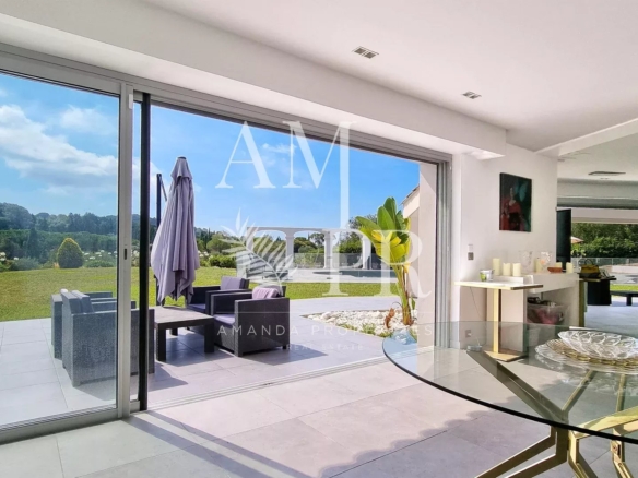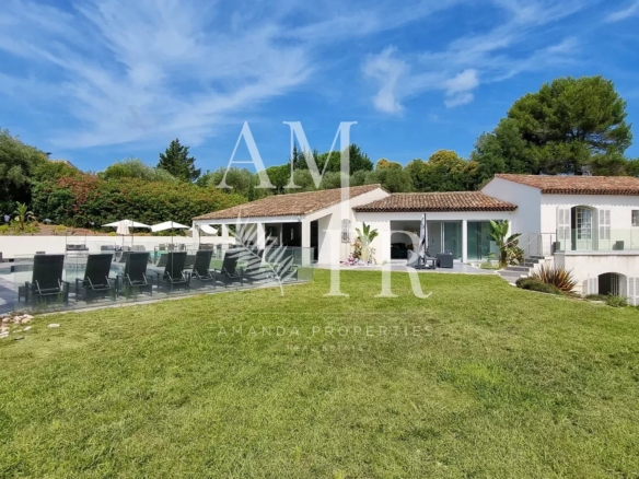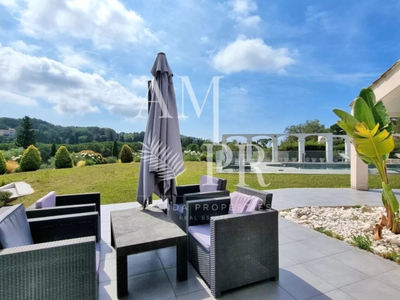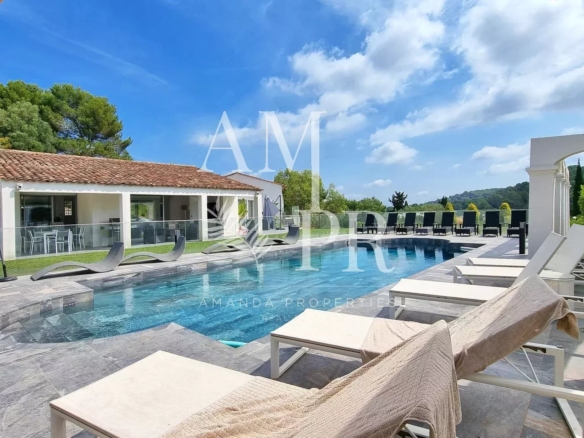 SOLE AGENT: Contemporary villa for sale in a gated estate in Mougins – Located in one of Mougins’ most prestigious domains this house offers spacious living inside and out. WIth 5 bedrooms including a lovely master suite which opens out with a lovely view over the gardens. This villa makes aperfect family home on 5000 m2 of flat land with plenty of space for entertaining and enjoying outdoor living. The main living area is located in the heart of the home with an amazing open plan flow throughout the interior and out onto the terraces and patios. The swimming pool is located at a very comfortable distance from the main living area an there is an additional smaller sized pool for the children