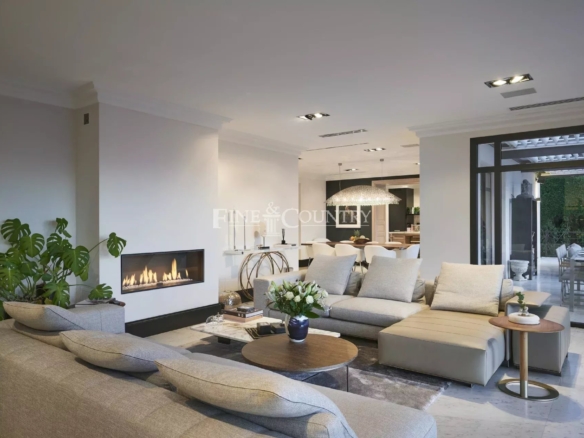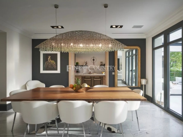 High-end, custom finishes are evident throughout the home, including beautiful marble floors, bespoke cabinetry and solid oak floors in the bedrooms. The spacious living areas feature large windows that offer breath-taking panoramic views of the surrounding hills, and a view of the sea over the Bay of Cannes and across to the Esterels Mountains, creating a serene and peaceful environment.