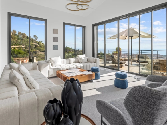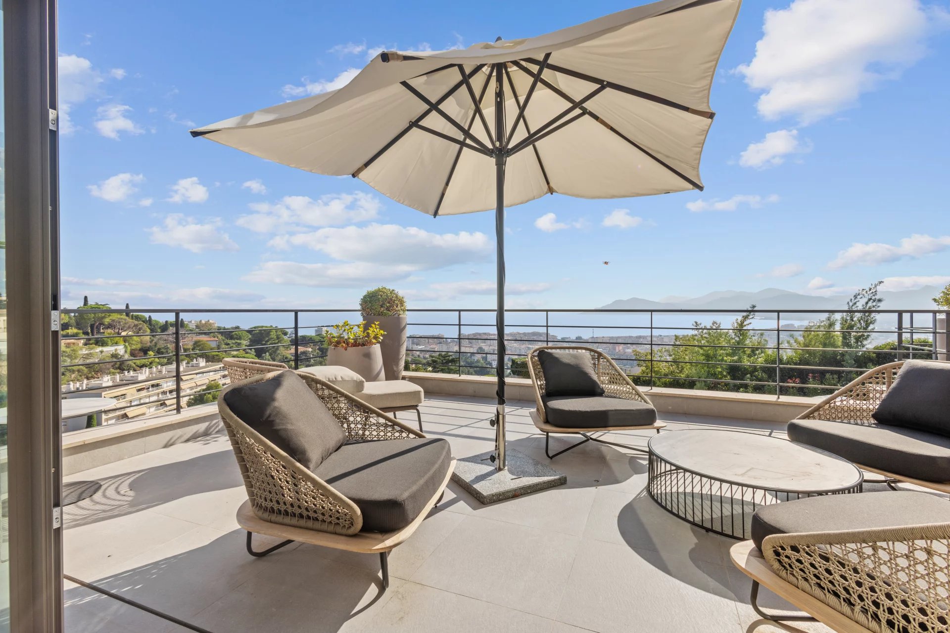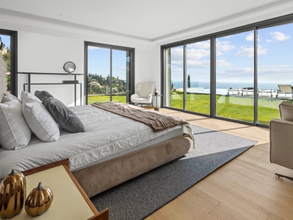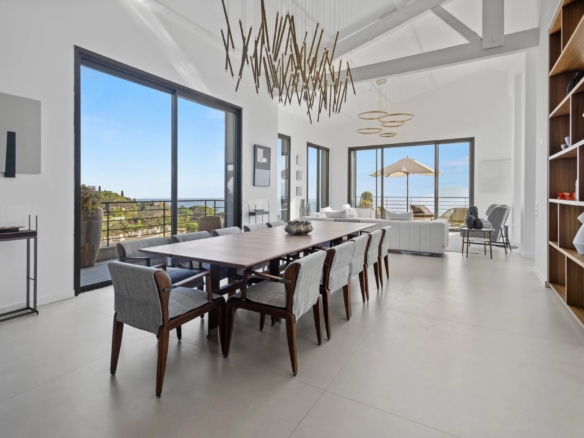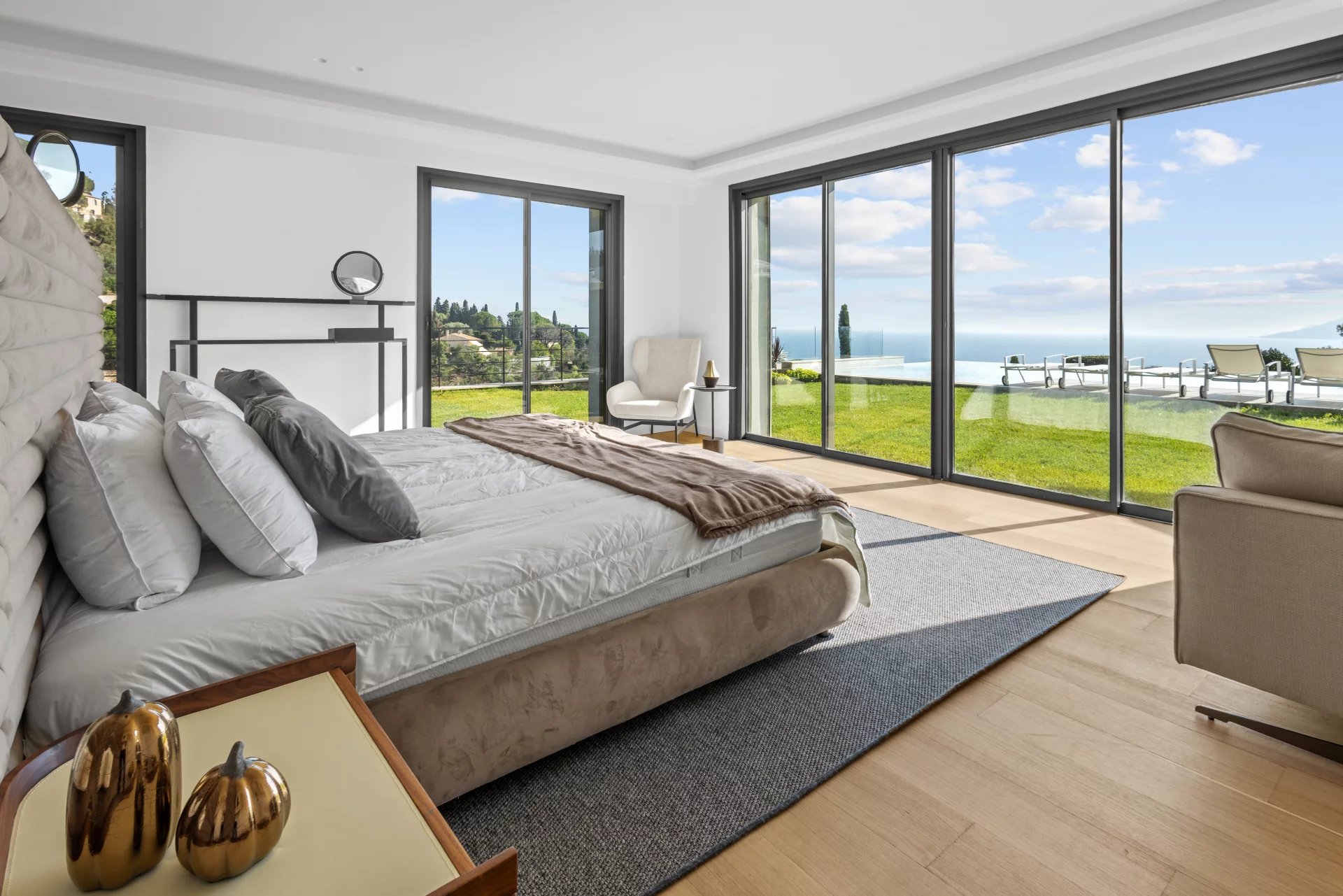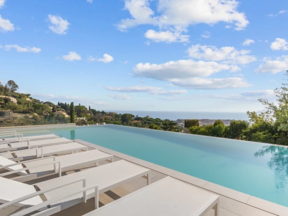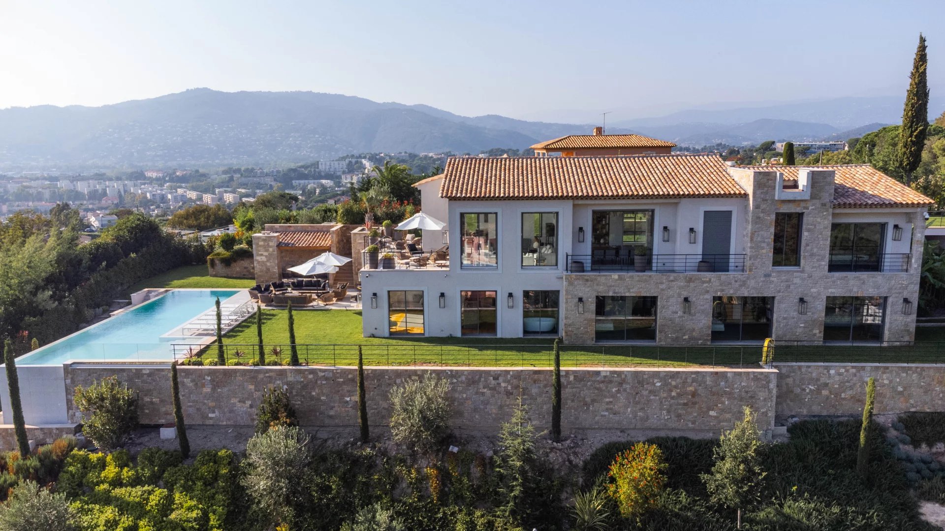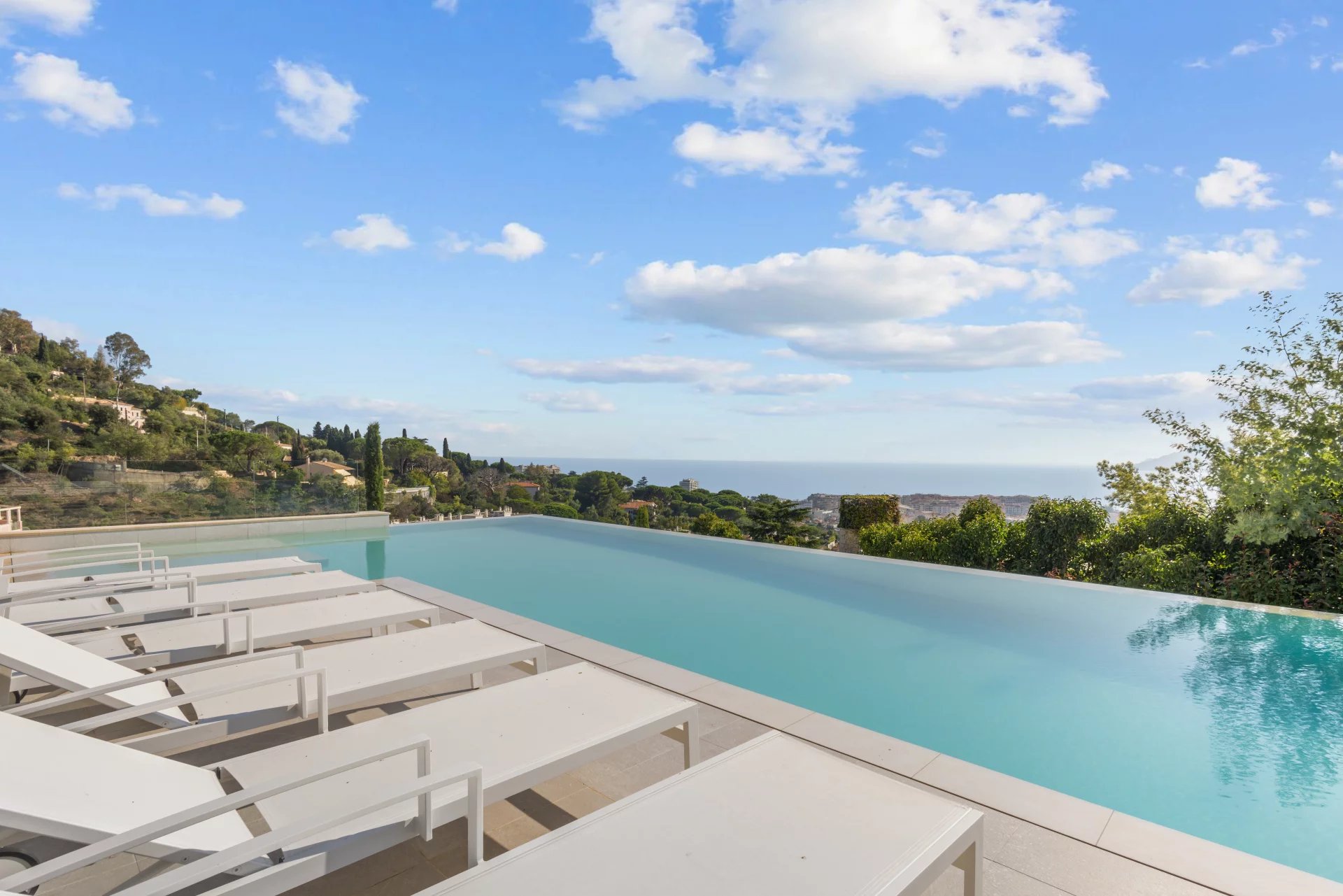 This villa, beautifully updated in 2023, offers stunning panoramic views of both the sea and the surrounding mountains, located in the desirable area of Cannes Croix des Gardes. The entrance on the main level opens into a vast living and dining area with an integrated kitchen, plus an en-suite bedroom, setting the tone for an elegant and comfortable lifestyle. Downstairs, the garden level features another living space with its own kitchen, leading out to a sweeping terrace with an infinity pool and a dedicated pool house. Here, the main en-suite bedroom is accompanied by a dressing area and three more en-suite bedrooms, each designed for privacy and style. The property also includes a triple garage and additional outdoor parking.