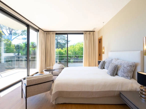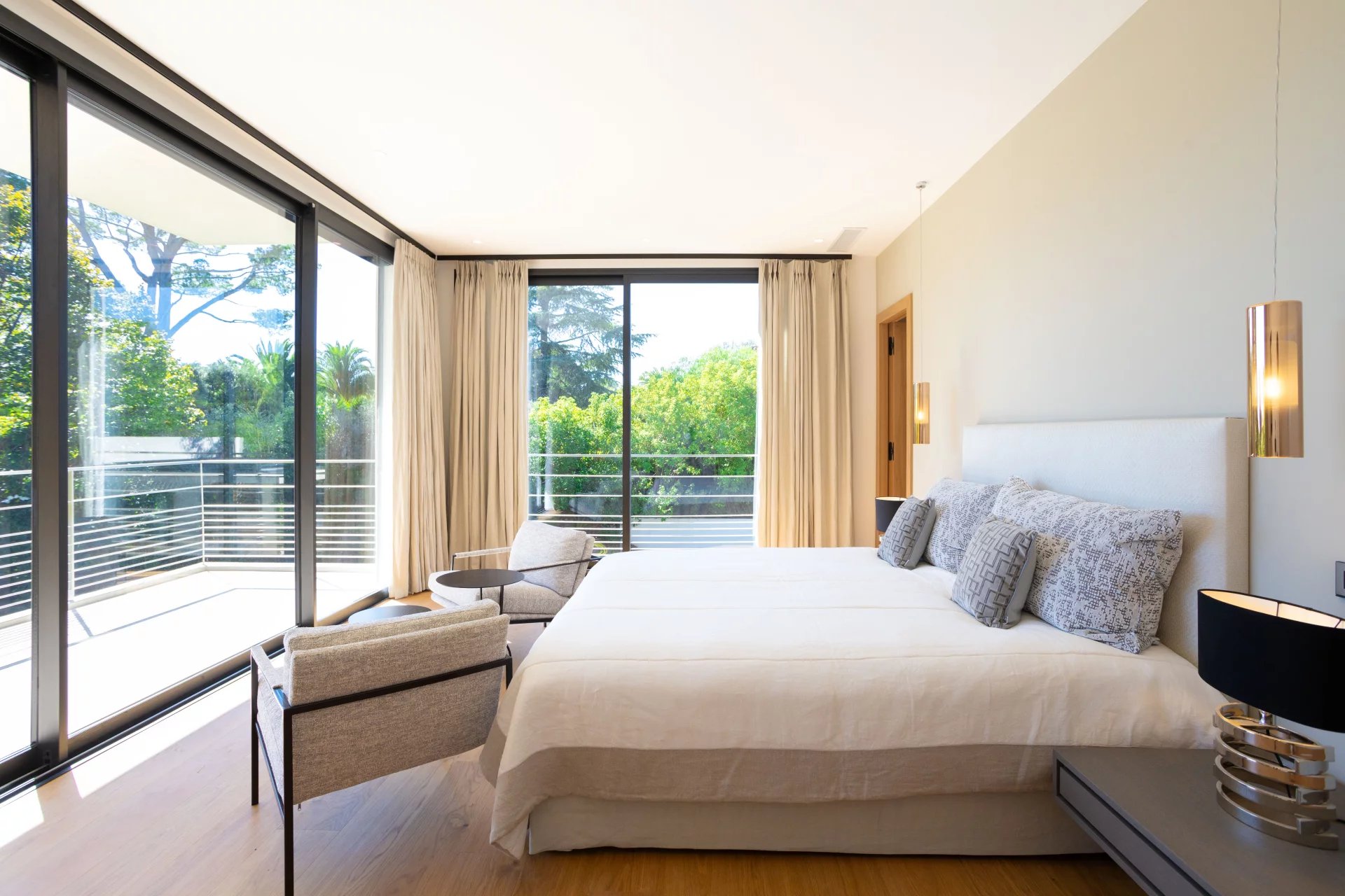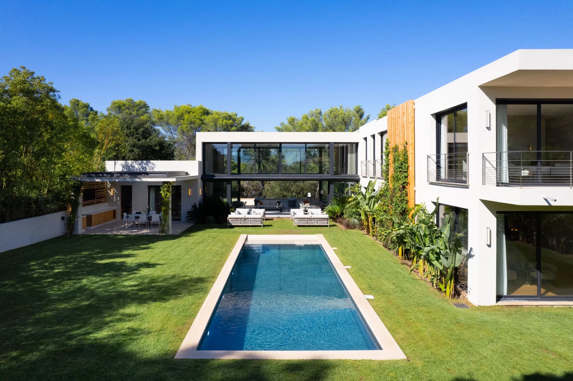 This newly built contemporary villa, located in a private, secure estate in Mougins, embodies modern luxury with its expansive 700 sq.m of living space. Completed in 2023, the villa features double-height ceilings in the large living and dining area, a fully equipped kitchen with utility room, and a main bedroom suite with a dressing room, complemented by an additional en-suite bedroom on the same floor. The second floor hosts three more en-suite bedrooms. The ground floor is a hub of entertainment with a cinema room, wine cellar, gym, playroom, an additional bedroom with a shower, and a laundry room. Outdoors, the villa boasts a 14x4m heated swimming pool, a summer kitchen with a dining area, extensive terraces, and a lift, making it the perfect luxury home.