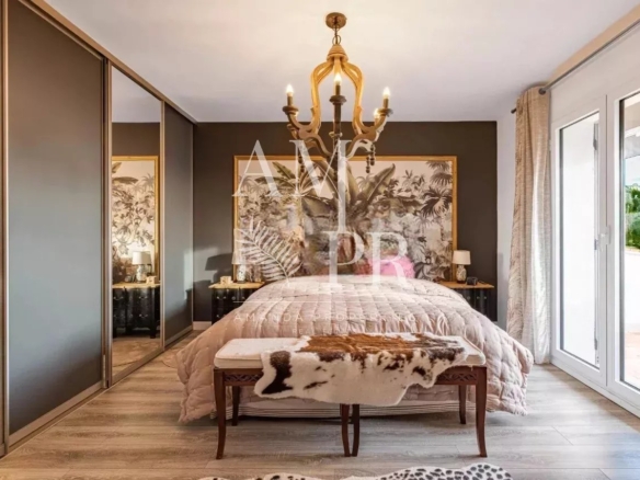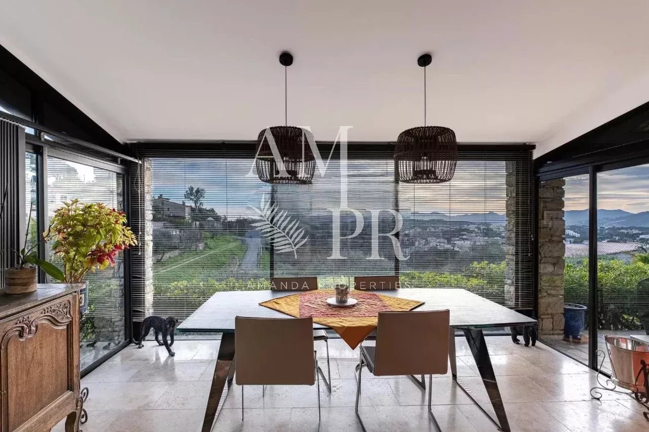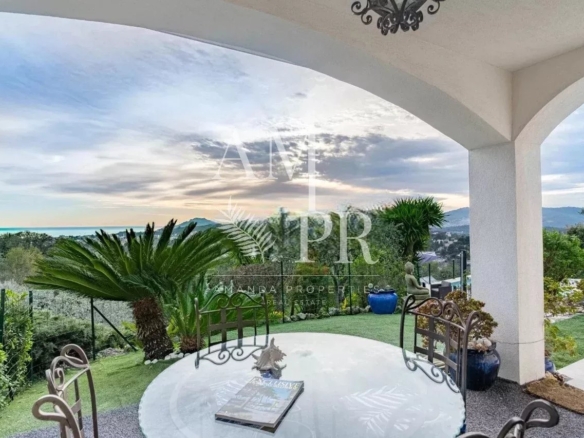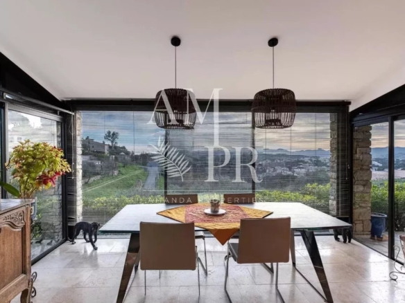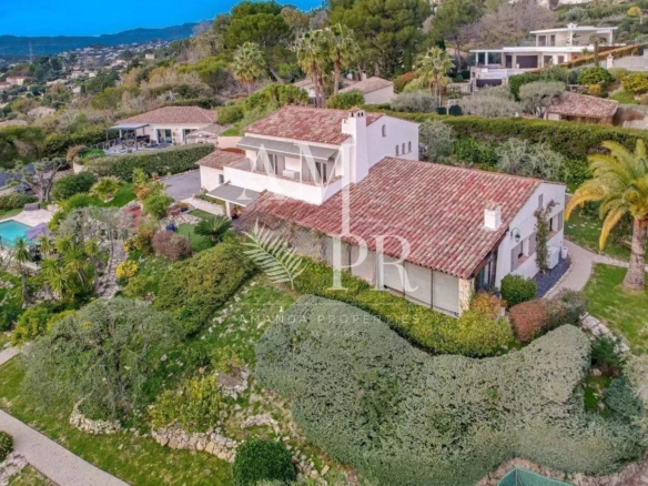 Villa with a panoramic sea view, over the Esterel and the hills of Mougins. With a south-facing exposure, it benefits from natural light as well as magnificent sunsets and sunrises.
