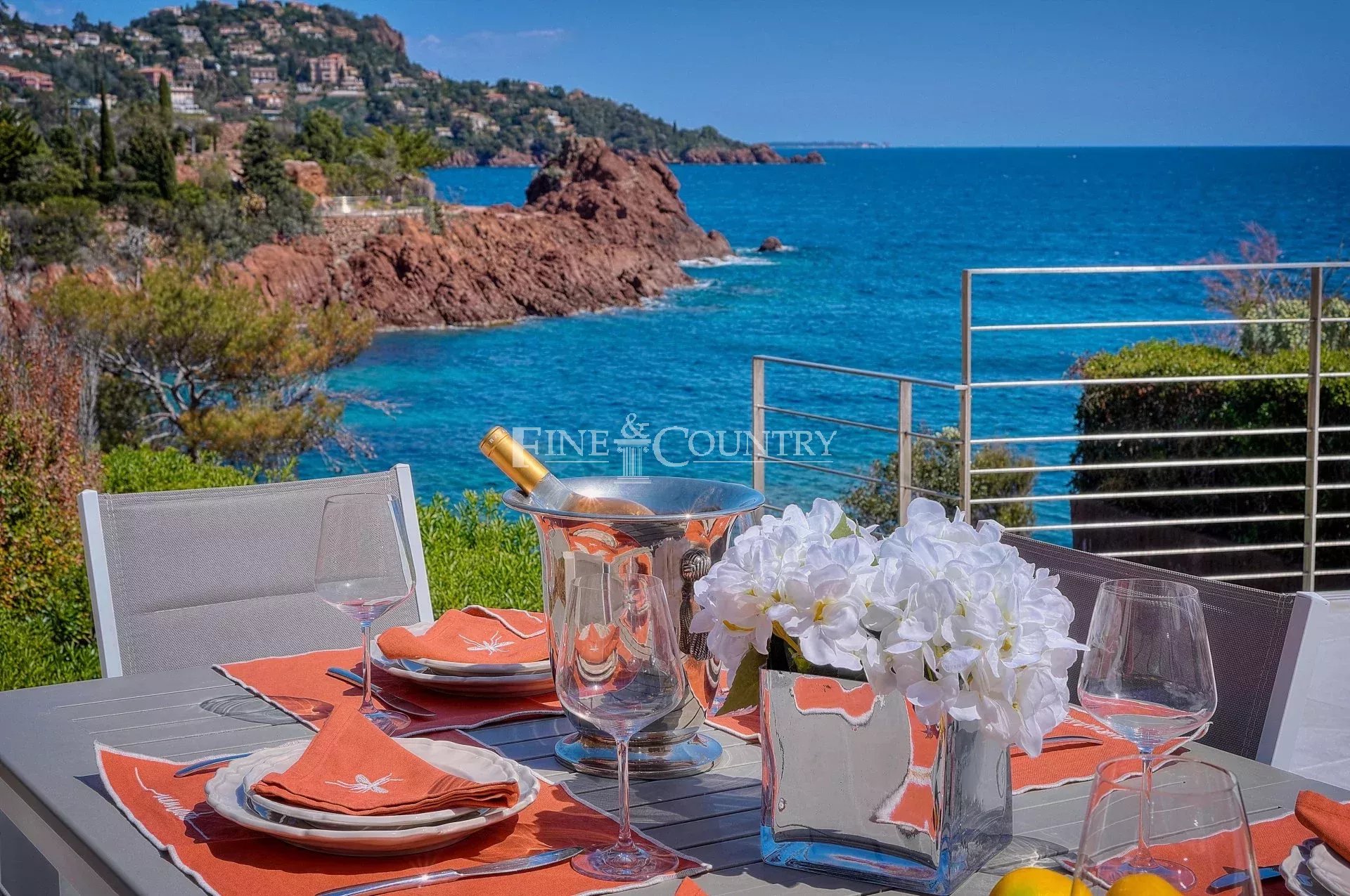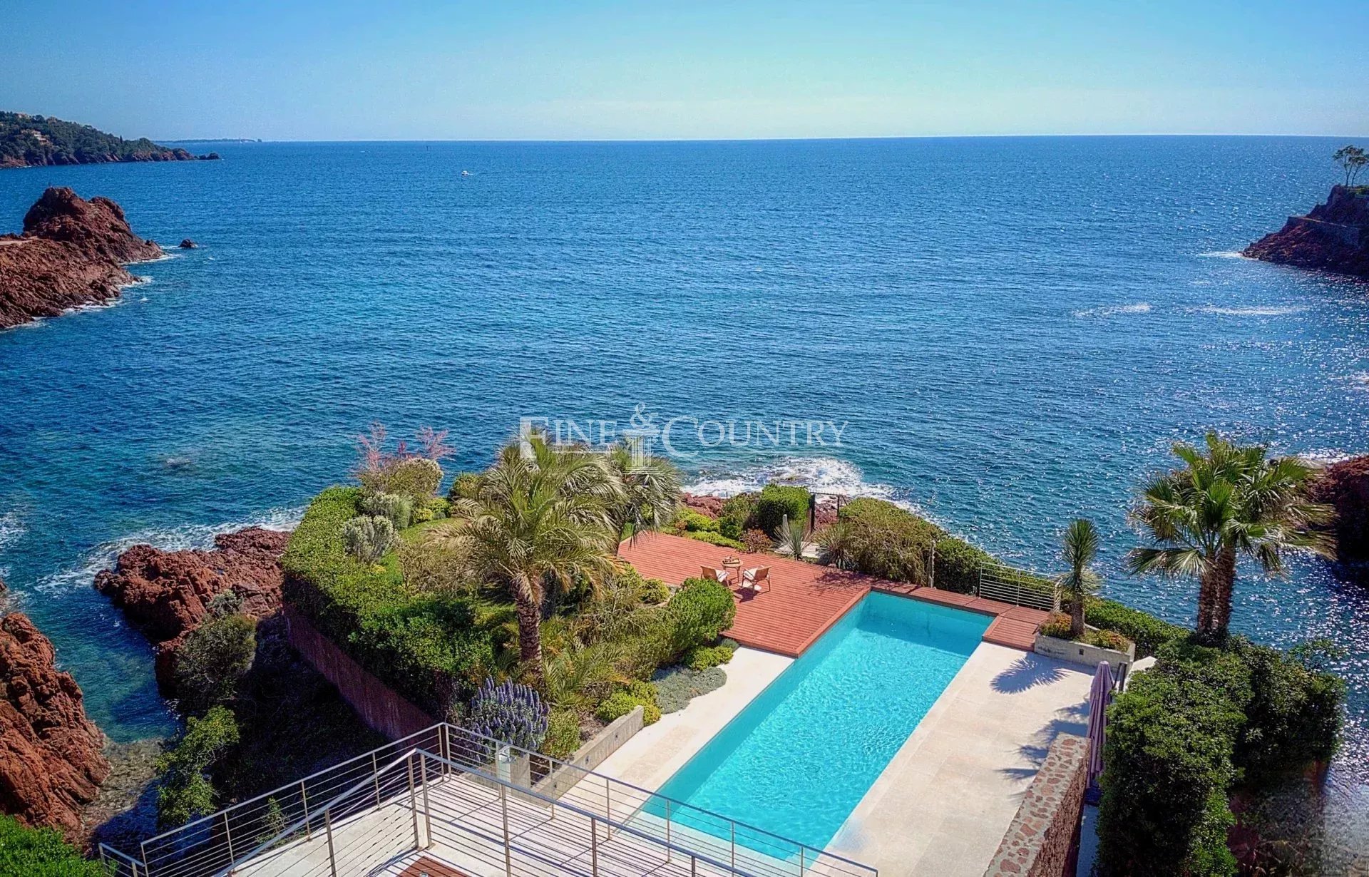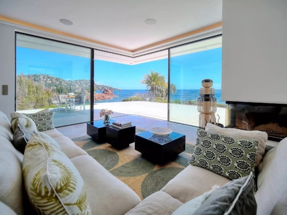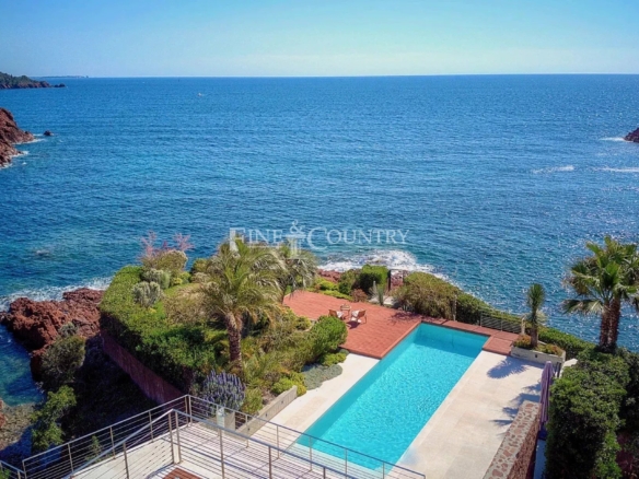 REF: 092023-09 With direct access to the sea, in one of the most beautiful natural settings on the Côte d’Azur where the contrast of the red rocks of the Esterel, stand out against the azur seas and natural vegetation, this unique property offers a prized and extremely rare waterfront location. Entirely renovated using high quality materials and simplistic design, allowing the environment and views to take the forefront, the property offers 2 separate villas. The main villa comprises 4 ensuite bedrooms and a wonderful indoor outdoor living and dining space with doors which slide into the walls allowing for the sea breeze to flow freely through the villa and from which to enjoy the fabulous sea views. Infront of the main villa is large terrace space, both covered and uncovered, which then lead down to the swimming pool and garden, and access direct to the sea below, through a small gate.
