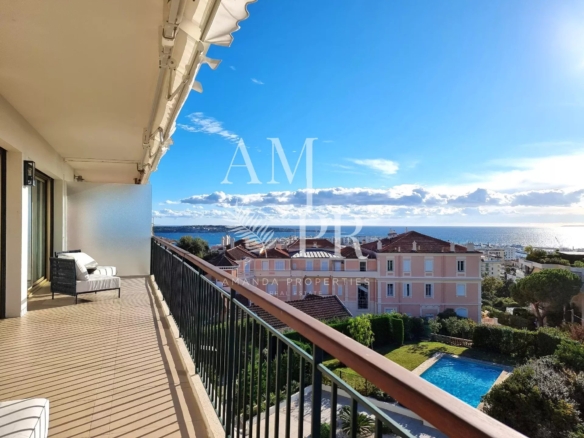 Top floor in a residence with park and pool, 136m2 living space with a south and west corner terrace of 40m2, offers a panoramic sea view of the Lerins Islands and the Esterel. At 10 minutes walk from the Croisette.