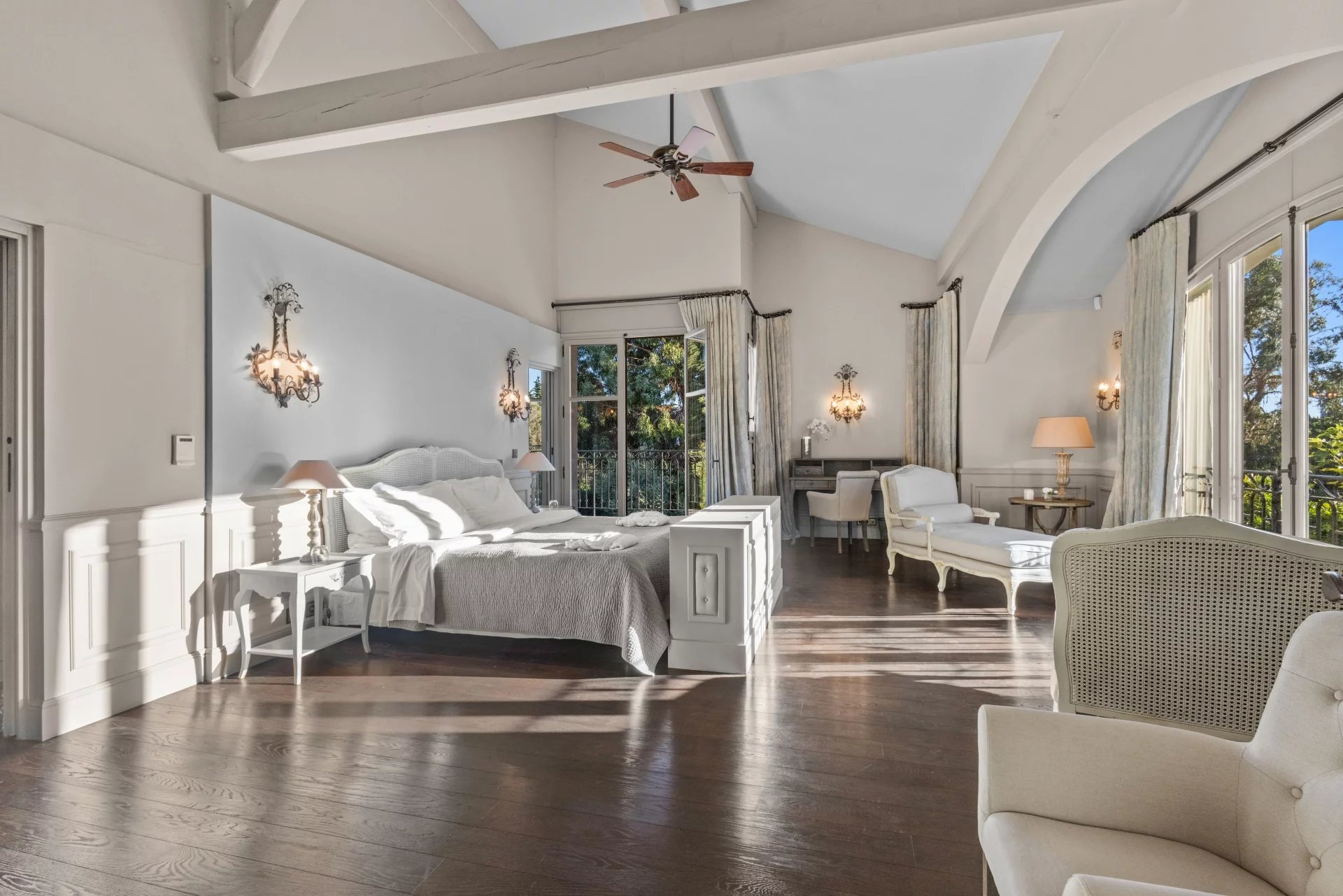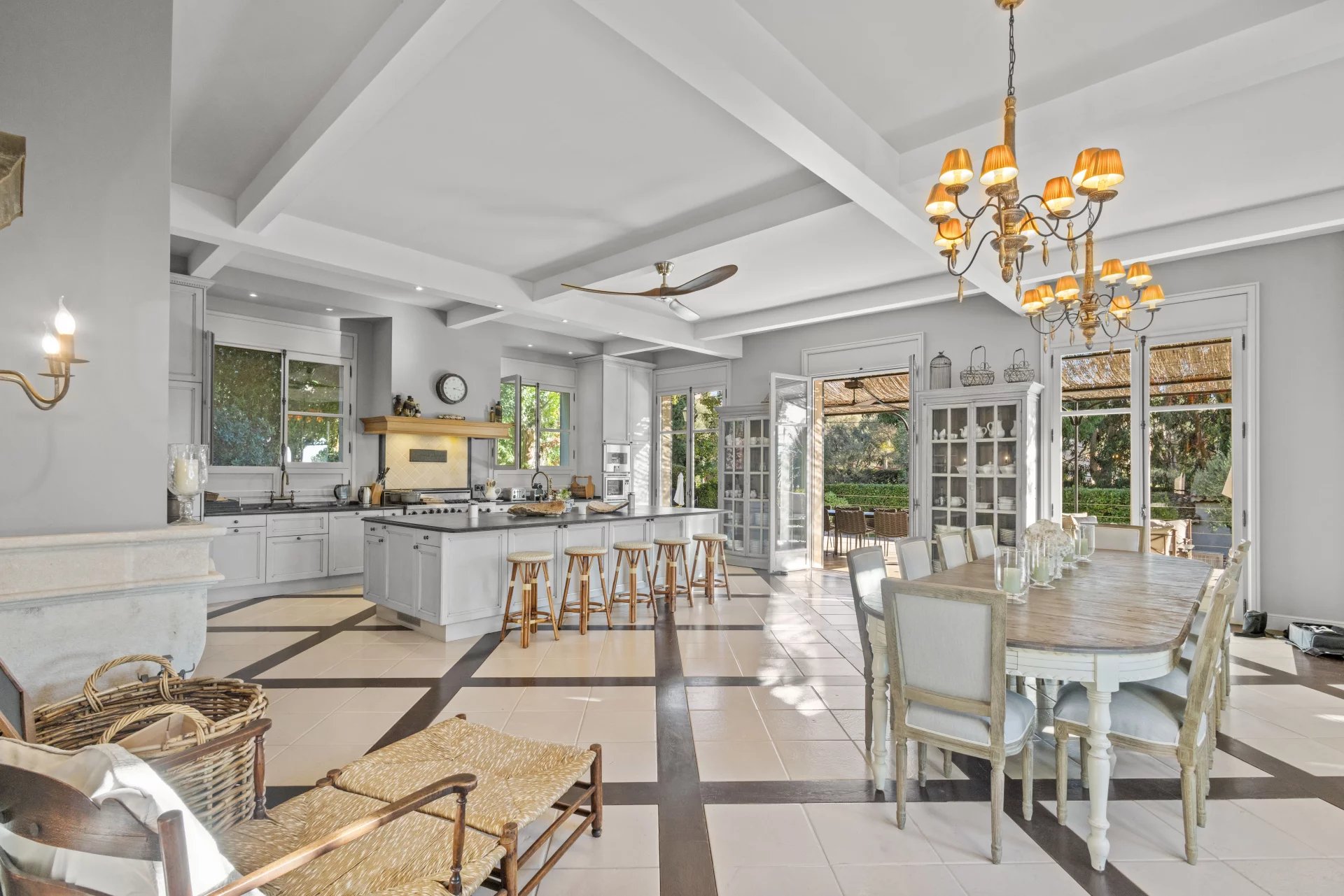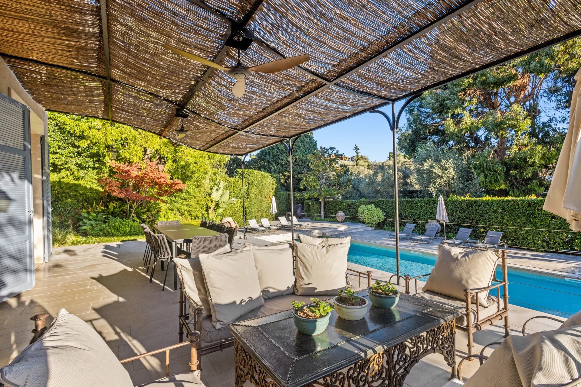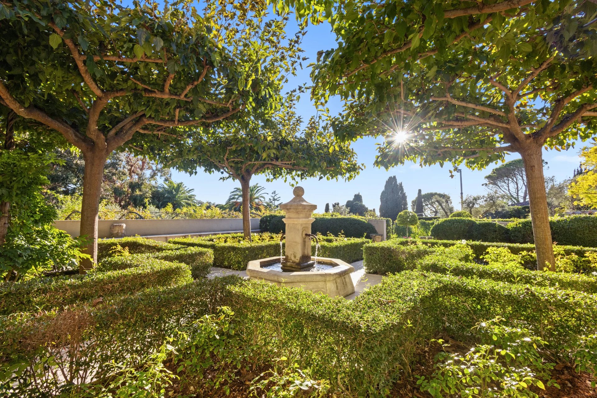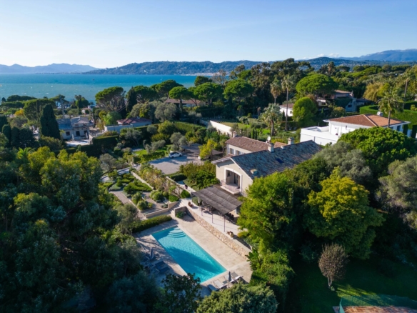 Outdoor amenities include a heated pool, a fully equipped fitness room, a sauna, a steam bath, a home cinema, and a tennis court. The expansive landscaped garden is adorned with Mediterranean flora and century-old olive trees that produce their own olive oil. An independent guesthouse adds to the appeal of this quintessential French Riviera villa.
